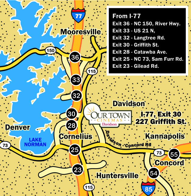 Our Town Cinemas - Davidson location is located in the Sadler Square Shopping Center now anchored by the Healthy Home Market (formerly the Home Economist) at 227 Griffith Street.